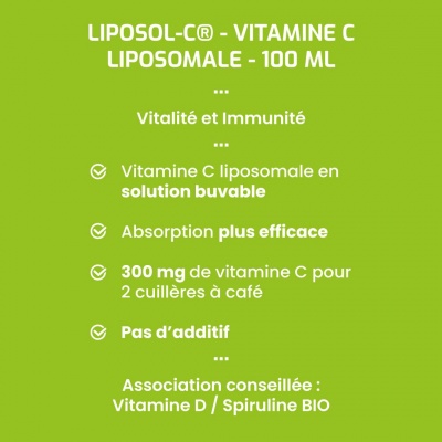 Liposol C® est une solution buvable de vitamine C sous forme liposomale. La vitamine C est encapsulée dans des liposomes formés de phospholipides issus de lécithine de soja non OGM. Cette forme améliore l’absorption et la biodisponibilité de la vitamine C.